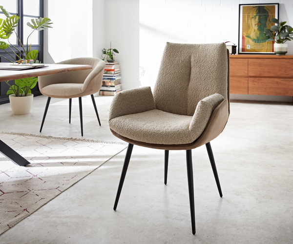 Clea-Flex ist ein eleganter Esszimmerstuhl in Premiumqualität. Sein Design in legerer Mattenoptik wirkt in jedem Essbereich modern und zeitlos. Durch seinen erstklassigen Polsteraufbau mit formstabilem Schaum, mehrfachen Diolen und hochwertigem Raumgewicht ist Clea-Flex extrem komfortabel. Die breite Sitzfläche und der hohe Rücken runden das Design und die Sitzqualität perfekt ab.Ein außergewöhnlicher Materialmix aus Mikrofaser an der Außen- und Strukturstoff in Bouclé Optik an der Innenseite schenkt dem Esszimmerstuhl einen außergewöhnlichen Look. Ob als Einzelstück oder als Sitzgruppe - die Verwendung von zwei Materialien macht ihn zum Design-Highlight.Premiumqualität neu definiert - Der Esszimmerstuhl Clea-FlexDer elegante 4-Fuß ist besonders standfest und durch sein einfach gehaltenes Design ein zeitloser Klassiker der mit vielen Wohnstilen kombiniert werden kann.Durch das aufwendige Verfahren der Pulverbeschichtung entsteht eine sehr regelmäßige Oberfläche, die besonders robust und widerstandsfähig gegen Kratzer und Beschädigungen ist. Dadurch lässt sich das Gestell einfach reinigen und bleibt lange schön. Maße ca.: B68 x T63 x H98 cm Sitzbreite ca.: 40 cm Sitztiefe ca.: 43 cm Sitzhöhe ca.: 51 cm Rückenhöhe ca.: 50 cm Armlehnenhöhe ca.: 68 cm Materialen: Sitzschale: Mikrofaser (100% Polyester), Bouclé (100% Polyester), Stuhlgestell: pulverbeschichtetes Metall Farbe: Sitzschale: Schlamm Vintage / Schlamm, Stuhlgestell: Schwarz Polsterung: hochwertige Vollschaummatte RG 40/60 mit Diolenunterfütterung Oberfläche: Soft Montagehinweis: teilmontiert, die Einzelelemente müssen miteinander verbunden werden Gewicht in kg: 12 Auf Grund hochwertiger Verarbeitung belastbar bis 125 Kg