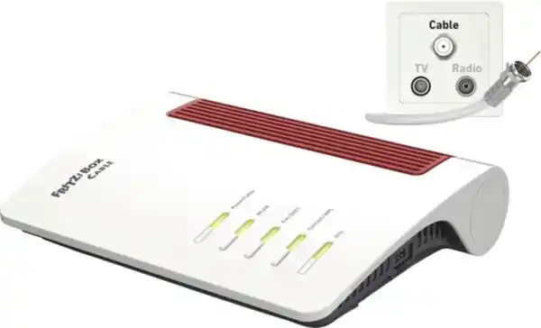 Kabelmodem/Router/TK, extern, Analog, DECT, FRITZ!App TV, per App steuerbar, Datenübertragung W-LAN Mesh, W-LAN, W-Lan 802.11 a, W-Lan 802.11 g, W-Lan 802.11 n, W-Lan 802.11 ac, W-Lan 802.11 ax, W-Lan 802.11 be, WiFi 7, Dual-Band-Betrieb, DLNA, Datentransferrate W-Lan maximal 3.568 MBit/Sekunde, Schnittstellen Kabelanschluss, Anschlüsse 5 x Ethernet RJ45 LAN, 1 x Anschluss für Analoge Telefone, Anrufbeantworter, Fax, 1 x USB 2.0, Media-Server