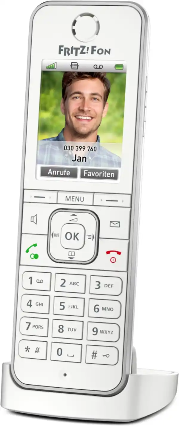 Mit dem Schnurlostelefon FRITZ!Fon C6 für die FRITZ!Box erweitert AVM die FRITZ!Fon-Reihe um ein Spitzenmodell. FRITZ!Fon C6 zeichnet sich durch ein ergonomisches und modernes Design, ausgefeilte Komfortfunktionen, bestechende Akustikeigenschaften und ein brillantes Farbdisplay aus. HD-Telefonie, Internetdienste und Smarthome-Steuerung FRITZ!Fon C6 überzeugt durch ein beeindruckendes Klangbild (High Definition) sowie zahlreiche Internetdienste, wie den Empfang von E-Mails, Internetradio, News-Feeds und Podcasts. Auch für Smarthome-Anwendungen, wie das Schalten von Geräten mithilfe der intelligenten Steckdoses FRITZ!DECT 200/210, oder zur Steuerung des Heizkörperreglers FRITZ!DECT 301 kann das FRITZ!Fon eingesetzt werden. Das brillante Farbdisplay (180 ppi), eine beleuchtete Tastatur sowie die intuitive Menüführung unterstützen den Anwender bei der Telefonie, Navigation und der Nutzung der Dienste. Umfangreiche Komfortfunktionen FRITZ!Fon C6 beherrscht sämtliche aus der Produktreihe bekannten Komfortmerkmale und stellt im Zusammenspiel mit einer FRITZ!Box bis zu 5 digitale Anrufbeantworter, eine übersichtliche Anrufliste sowie Telefonbücher mit bis zu 300 Einträgen bereit. Eingegangene Anrufe, Nachrichten auf dem Anrufbeantworter, E-Mails und Software-Updates werden an das FRITZ!Fon per Display und MWI-Taste signalisiert und sind auf Knopfdruck verfügbar. Für längere Akkulaufzeiten sorgen der vergrößerte Akku, ein smartes Energiemanagement, sowie ein sensibler Helligkeitssensor, der die Beleuchtung von Display und Tastatur je nach Umgebungslicht anpasst. Der integrierte Bewegungssensor weckt das Telefon aus dem Standby, wenn der Nutzer es in die Hand nimmt. FRITZ!Box als idealer Partner Alle FRITZ!Box-Modelle mit integrierter DECT-Basisstation – egal ob für DSL, Kabel oder LTE – sind ideal für das FRITZ!Fon C6 geeignet. Die FRITZ!Box stellt sämtliche Datendienste und Komfortfunktionen für das FRITZ!Fon zur Verfügung. Einstellungen können bequem über die FRITZ!Box-Benutzeroberfläche vorgenommen werden. Alle Sprach-, Audio- und Steuerdaten werden über den robusten DECT-Funk sicher verschlüsselt übertragen. Bei aktiviertem DECT Eco Mode schalten die FRITZ!Box und die Handgeräte den DECT-Funk im Standy-by-Betrieb vollständig ab.
