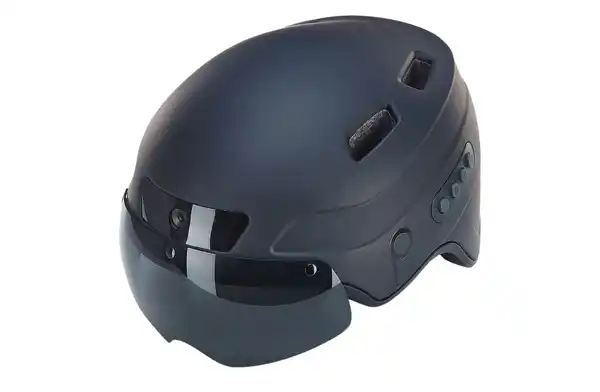 Smart Helm INMOLD• Geeignet für Jugendliche und Erwachsene mit einem Kopfumfang von 54-58 cm (Größe M) und 58 bis 61 cm (Größe L) • Inmold Technologie für eine äußerst leichte und stabile Helmstruktur• Kopplung mit dem Smartphone möglich: Musik abspielen, Anruf tätigen, Sprachassistent, Navigation• Integrierte Full-HD Kamera und Lautsprecher• Bildauflösung: 4032 x 2880, Videoauflösung: 1920 x 1080 • Bluetooth 4.0 Freisprech-Audiosystem (Reichweite: 8 Meter)• Ladezeit: 4 Stunden• Anzeigesignale (rechts und links) per mitgelieferter Fernbedienung möglich• Anzeigesignale ersetzen kein manuelles Handzeichen• Gewicht: 500 g • Farbe: Schwarz Lieferumfang: Helm, Visier, Fernbedienung, Akku, Ladekabel
