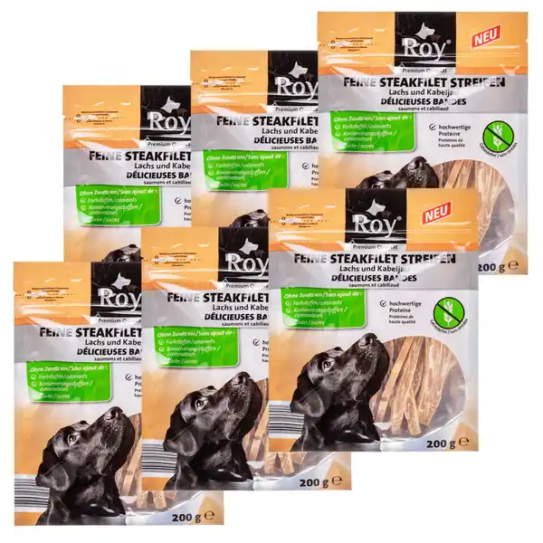 ROY Feine Steakfilet Streifen- Lachs und Kabeljau 6er Hochwertige Proteine Glutenfrei Gewicht 200g BeutelVarianten Lachs und Kabeljau Ente und Kabeljau HappenLieferumfang 6x ROY Feine Steakfilet Streifen- Lachs und Kabeljau