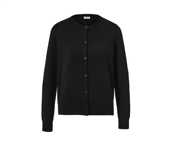 Feinstrick-Cardigan Farbe: Schwarz Material: 70% Viskose, 30% Polyamid Maße: Gesamtlänge ca. 64 cm (Gr. M 40/42) Passform: Regular Fit Weiche Qualität mit ViskoseElastische Rippbündchen an Ausschnitt, Ärmelabschluss und SaumVorderseite mit KnopfleisteRundhalsausschnittDieser Cardigan beinhaltet Fasern aus nachhaltigem Holz.