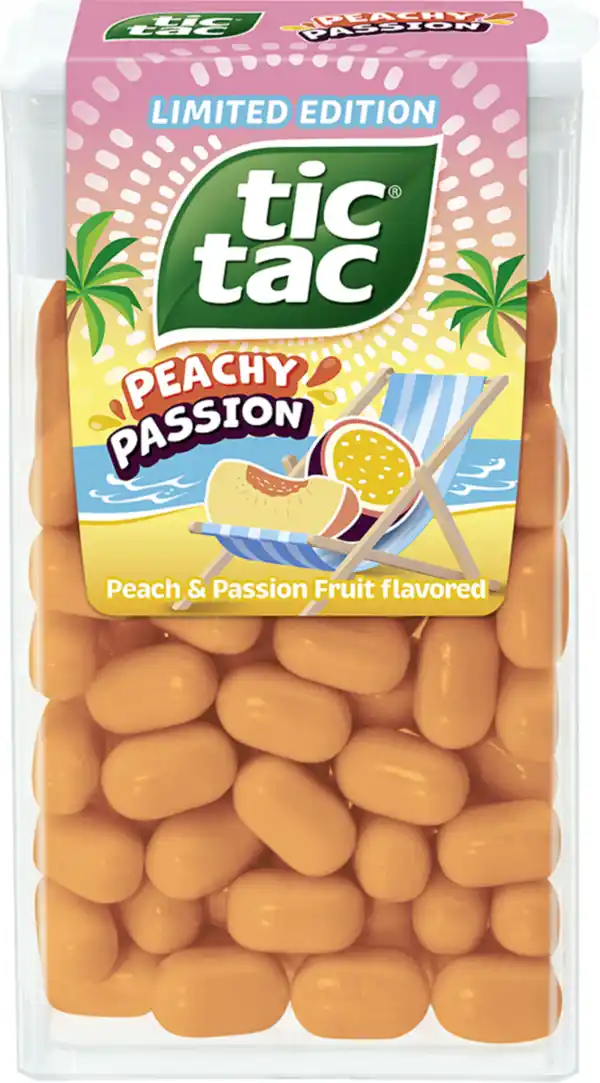 Erleben Sie sommerlichen Genuss mit den neuen Tic Tac Peachy Passion! Die Limited Edition vereint den fruchtig-süßen Geschmack von Pfirsich und Passionsfrucht in jedem Dragee. Perfekt für unterwegs – erfrischend, exotisch, unwiderstehlich! Jetzt nur für kurze Zeit.