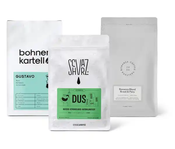 Filterkaffee Probierset "Dreierpack schokoladig" - 3x 250 g Ganze Bohne Aufbewahrungshinweise: Trocken, dunkel und vor Wärme geschützt lagern. Probierpaket bestehend aus zwei verschiedenen Filterkaffee-Röstungen und einer Omni-Roast-RöstungSet beinhaltet 1x Blend Omni-Roast von Bonanza, 1x DUS Filterkaffee von Schvarz, 1x Gustavo Filterkaffee von BohnenkartellIdeal für die Zubereitung als Filterkaffee3x 250 g Ganze Bohne