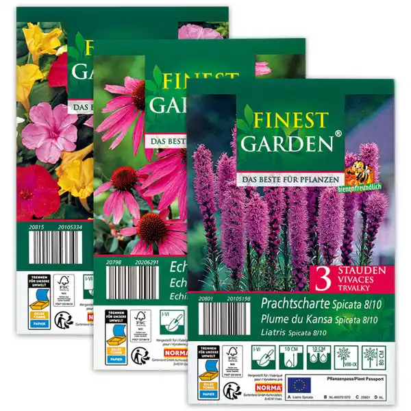 in den Sorten z.B.: Liatris Prachtscharte, Crocosmia Red King, Heliopsis Sonnenauge, Echinacea Purpurea, Phlox Flammenblume, Lupinus Hybride, Gypsophila Schleierkraut, Kniphofia Fackellilie, Convallaria Maiglöckchen oder Mirabilis Wunderblume je 1 Stück