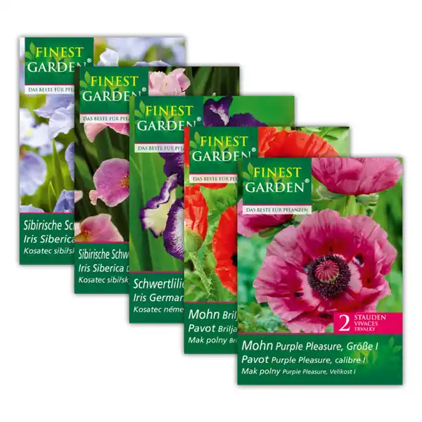 - in den Sorten z.B.: Papaver "Purple Pleasure", "Briljant", "Perry's White", "Effendi", Iris "Carribean Blue", "Edith Woolford", "Sultan's Palace", "Loop the Loop", "How Audacious", "Timped in Blue", "Dance Ballarina Dance" oder "Peacock Butterfly Mission Bay" je Packung
