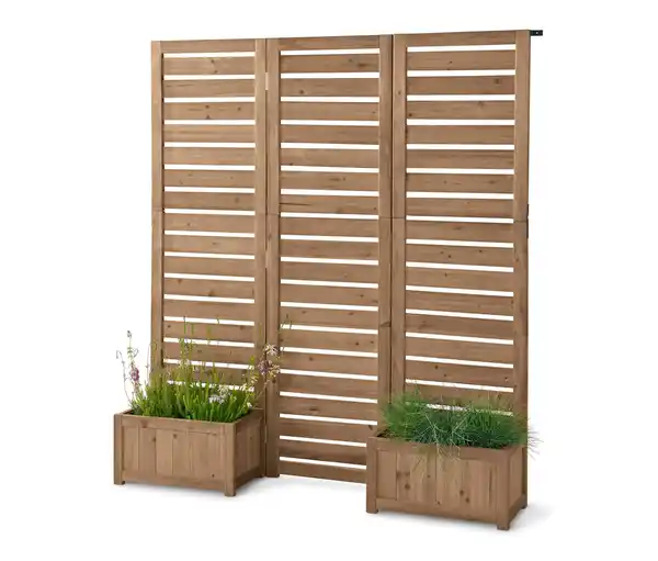 Flexibler Paravent mit Pflanzkästen Farbe: Holz naturfarben Innenliegender Boden silberfarben Folie, Wandbefestigung und Füße schwarz Material: FSC®-zertifiziertes Massivholz, lasiert Beschläge Stahl, pulverbeschichtet Folie 100% Polyethylen Bodenplatte der Pflanzkästen und Schrauben Stahl, verzinkt Bodenschoner 100% Polypropylen Maße: B x H x T ca. 150 x 167 x 30,5 cm B x H x T Sichtschutz-Elemente inkl. Pflanzkasten je ca. 49,6 x 167 x 30,5 cm B x H x T Pflanzkästen außen je ca. 49,6 x 26 x 28 Inhalt: Inkl. perforierter Folie, Bodenschonern, Wandbefestigung, Montagematerial und -anleitung Gewicht: Max. 18,7 kg Pflanzkästen je max. 30 kg Tragkraft: Pflanzkästen je c.a 22 l Gebrauchsanweisung: UV- und witterungsbeständig Sonstige Hinweise: Artikel wird zerlegt geliefert Lieferung in 1 Packstück B x H x T Packstück ca. 107,6 x 24,1 x 54,3 cm, Gewicht ca. 21,1 kg Ideal als Sichtschutz und Raumteiler nutzbarEinzelne Sichtschutz-Elemente flexibel drehbarPflanzkästen mit verzinktem Stahlboden: leichtes Gefälle und Wasserablauf verhindern StaunässePflanzkästen mit innenliegender Folie, Folienboden perforiert für WasserdurchlassHöhenverstellbare Bodenschoner, fester Stand auch auf unebenen FlächenInkl. WandbefestigungAus FSC®-zertifiziertem Massiv-Holz, lasiertUV- und witterungsbeständig