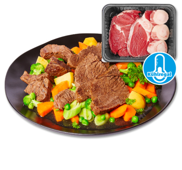 - Bestehend aus Suppenfleisch ohne Knochen, Beinscheibe und Markknochen, im Frischfleischregal