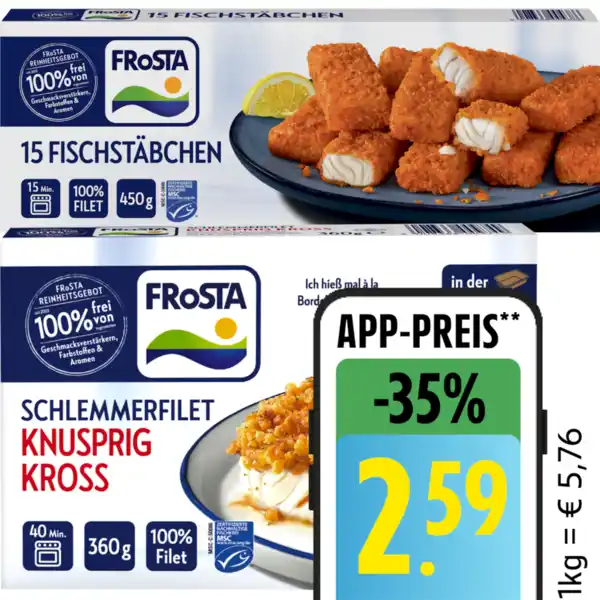tiefgefroren, versch. Sorten, z.B. Fischstäbchen, 450g