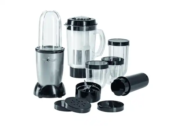 9 versch. Funktionen (mixen, entsaften, rühren, zerkleinern, aufbewahren, mahlen, hacken, schlagen oder pürieren), 400 Watt