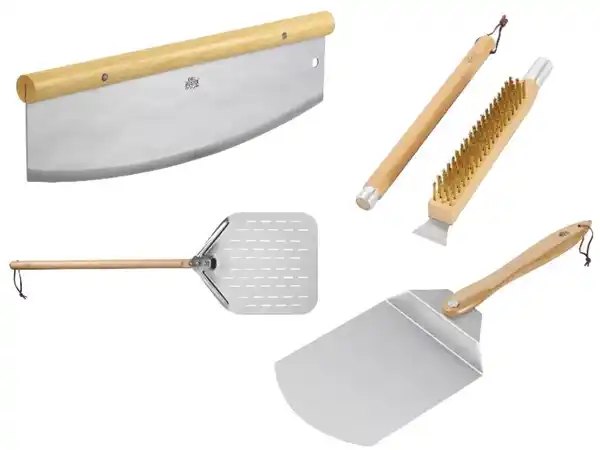 Maße:Pizzaschieber: Gesamtlänge: ca. 92 cm\ Schaufelkopf: ca. L 36,5 x B 30,5 cm Pizzaschieber (klappbar): Gesamtlänge: 65 cm\ Schaufelkopf: ca. L 35 x B 25 cm Pizzaschneider: Gesamtlänge: ca. 40 cm Pizzaofen-Bürste: Gesamtlänge: ca. 63 cm