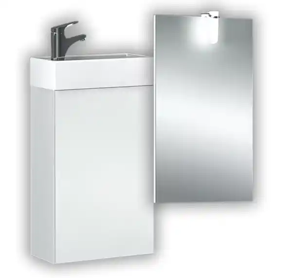 weiß, bestehend aus: Spiegel (ca. 40 x 60 cm) und Unterschrank (41 x 68 x 22 cm) inkl. Keramikwaschtisch und Beleuchtung (o. Armatur) (Alle Angaben in B x H bzw. B x H x T)
