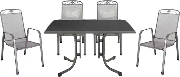 Verleihen Sie Ihrem Außenbereich mit dem Boulevardklapptisch und den 4 Stühlen eine stilvolle und praktische Note. Der Klapptisch mit anthrazitfarbenem Gestell und schieferfarbener Platte kombiniert zeitloses Design und Funktionalität. Das robuste Stahlgestell sorgt für Stabilität und Langlebigkeit, während die klappbare Konstruktion eine platzsparende Lagerung ermöglicht. Die Tischplatte aus Mecalit®-Pro ist einfach zu reinigen und pflegeleicht, ideal für den täglichen Gebrauch.