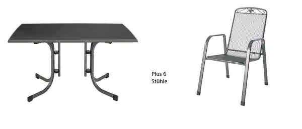 Verleihen Sie Ihrem Außenbereich mit dem Boulevardklapptisch und den 6 Stühlen eine stilvolle und praktische Note. Der Klapptisch mit anthrazitfarbenem Gestell und schieferfarbener Platte kombiniert zeitloses Design und Funktionalität. Das robuste Stahlgestell sorgt für Stabilität und Langlebigkeit, während die klappbare Konstruktion eine platzsparende Lagerung ermöglicht. Die Tischplatte aus Mecalit®-Pro ist einfach zu reinigen und pflegeleicht, ideal für den täglichen Gebrauch.