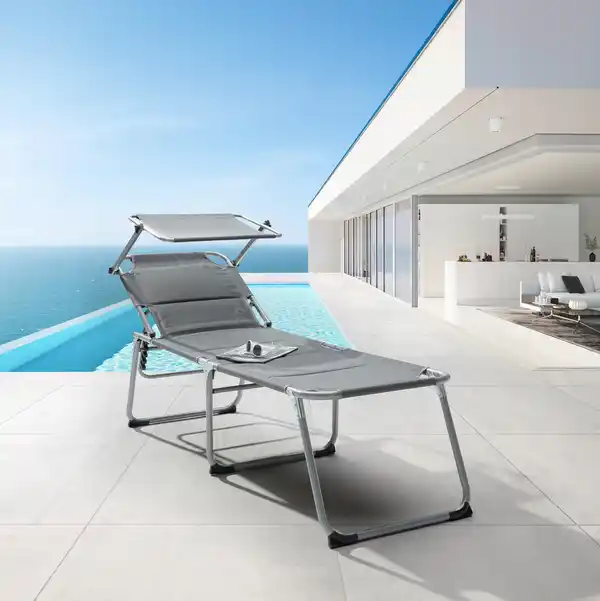 Ein echter Klassiker in Sachen Design und Funktionalität ist die dreibeinige Gartenliege HARALD mit rostfreiem Eisengestell in Silber und Textil-Bezug in Grau. Da sie sich zusammenklappen lässt, können Sie sie schnell den Platz an der Sonne wechseln oder sie sogar mit an den See nehmen. Dabei fehlt es Ihnen dank Sonnendach auch nicht an Schatten. Bei den Maßen von ca. 196 x 45 x 59 cm (B x H x T) können Sie sich genüßlich ausstrecken, die verstellbare Rückenlehne ermöglicht ein entspanntes Sitzen beim Schmökern in der Lieblingszeitschrift. Die Liege darf mit höchstens 120 Kilogramm Gewicht belastet werden.