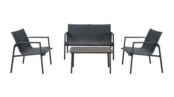 Entspannen unter freiem Himmel - mit dem Gartenmöbel Set LENI! Das Gartenmöbel Set LENI vereint modernes Design, Komfort und Funktionalität - perfekt für entspannte Stunden auf der Terrasse, dem Balkon oder im Garten. Mit seinem stilvollen Textilgewebe in Grau und dem schwarzen Metallgestell wirkt dieses 4-teilige Loungeset zeitlos elegant und fügt sich harmonisch in nahezu jede Outdoor-Umgebung ein. Schaffen Sie sich eine stilvolle Wohlfühloase im Freien - ideal für entspannte Sommerabende, gesellige Gespräche oder ruhige Momente unter freiem Himmel. Der gemütliche 2-Sitzer mit einer Größe von ca. 119 x 64 x 81 cm bietet ausreichend Platz für gemeinsame Momente im Freien - ob beim morgendlichen Kaffee, einem guten Gespräch am Abend oder einfach zum Zurücklehnen und Entspannen. Ergänzt wird das Set durch 2 Armlehnstühle, die mit einem luftdurchlässigen Textilgewebe für ein besonders bequemes Sitzgefühl sorgen - auch an warmen Sommertagen. Der passende Tisch mit den Maßen ca. 85 x 48 x 44 cm rundet das Ensemble perfekt ab. Hier finden Getränke, Snacks oder eine kleine Dekoration ihren Platz und machen das Set zu einem praktischen Mittelpunkt Ihrer Outdoor-Lounge. Bestellen Sie gleich über unseren Onlineshop oder lassen Sie sich von einem unserer Experten beraten.Wir freuen uns auf Sie!