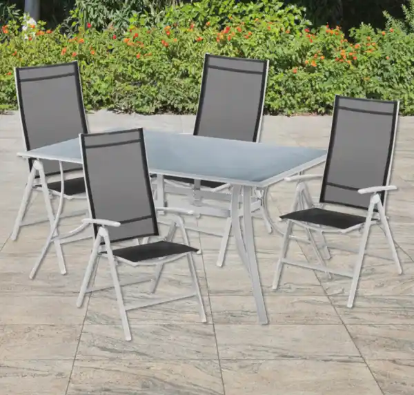 5-teilig, 4 Klappsessel und Tisch, Gestell aus Aluminium, pulverbeschichtet, Bezug aus Textilene, Klappsessel: mehrfach verstellbare Rückenlehne, Tisch: mit Sicherheitsglasplatte, 150 x 71 x 96 cm (B x H x T)