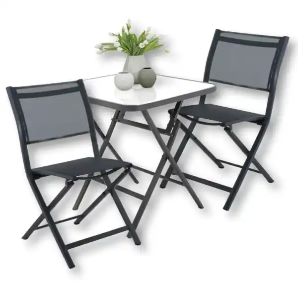 3-teilig, 2 Klappstühle: je ca. 47 x 83 x 51 cm, Textilene-Bespannung und Tisch mit Glasplatte und Klappfunktion, ca. 70 x 74 x 70 cm (Alle Angaben in B x H x T) (o. Deko)