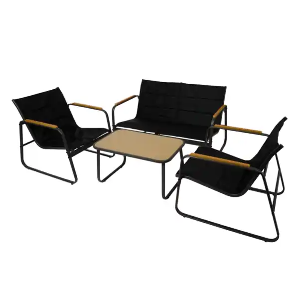 Dieses Gartenmöbelset besteht aus einer großen Bank, zwei bequemen Sesseln und einem Tisch mit Glasplatte. Es ist ideal für gemütliche Stunden mit Familie und Freunden. Der robuste Stahlrahmen und die langlebigen Sitzbezüge sorgen für jahrelangen Sitzkomfort und sind pflegeleicht, damit du die Zeit draußen unbeschwert genießen kannst