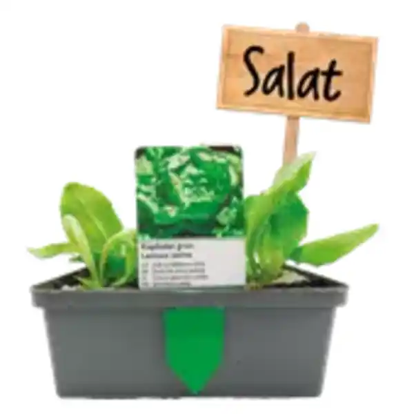 versch. Sorten wie z. B. Kohlrabi, Lollo Rossa oder Kopfsalat, mit 6 Pflanzen pro Schälchen