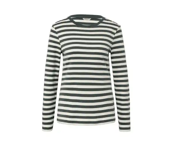 Gestreiftes Langarmshirt Farbe: Dunkelgrün-cremeweiß gestreift Material: 100% Baumwolle Maße: Gesamtlänge ca. 66,5 cm (Gr. M 40/42) Passform: Regular Fit Schulternaht einseitig mit ZierknöpfenWeiche Interlock-Qualität aus reiner BaumwolleRundhalsausschnittDieses Langarmshirt fördert den Anbau nachhaltiger Baumwolle.
