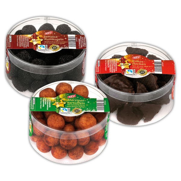 ### Weihnachts-Spezialitäten in der Dose Marzipankartoffeln, Kokosflocken oder Jamaica-Rumkugeln - - - - - - Das Fairtrade Kakao Programm ermöglicht es Kleinbauern, mehr Kakao unter Fairtrade-Bedingungen zu verkaufen. Kakao mit Mengenausgleich. Mehr auf www.info.fairtrade.net/sourcing 260-g-Dose (1 kg = 10,73) je Dose