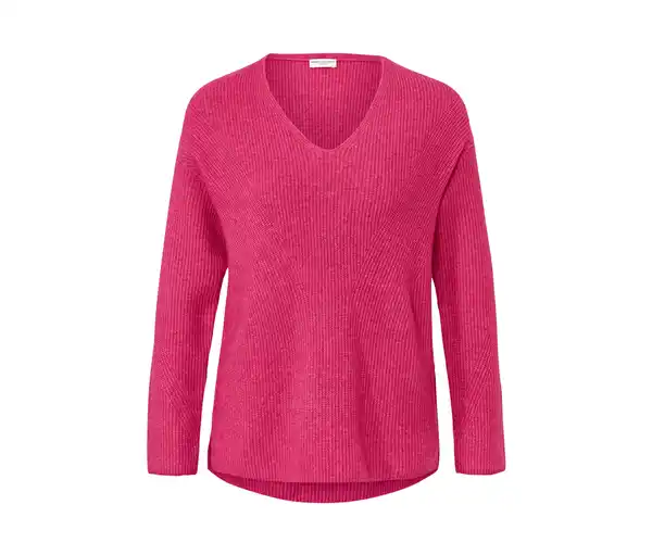 Grobstrickpullover, himbeere Farbe: Himbeerrot Material: 40% Polyester (recycelt), 30% Polyamid, 26% Polyacryl, 4% Elasthan Maße: Gesamtlänge ca. 65 cm (Gr. M 40/42) Passform: Regular Fit Weiche und wärmende QualitätV-Ausschnitt Vorder- und Rückseite mit hochwertigem StrickmusterLeicht verlängerte RückenpartieMit Elasthan: formbeständig, perfekter Sitz, hoher TragekomfortDieser Pullover schont Ressourcen.