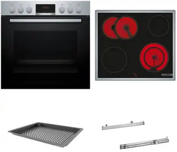 Bosch Einbau-Geräte-Set HND411US63 Mit dem HND411US63 bietet Bosch Ihnen ein Einbau-Geräte-Set, welches aus einem Einbauherd und einem Glaskeramikfeld besteht. Für niedrige Kosten steht der Verbrauch von gerade mal 0,94 kWh bei Ober-/Unterhitze und 0,69 kWh bei Heißluft/Umluft. Im Durchschnitt liegende 71 Liter Innenraumvolumen haben Platz für Plätzchen, Aufläufe und Co. Auf 4 Kochzonen bietet das Einbau-Geräte-Set Platz für Töpfe. Die Programme beim HND411US63 Es stehen Ihnen einschließlich Ober-/Unterhitze die Backofenoptionen 3D-Heißluft und Schnellvorheizfunktion zur Verfügung. Lässt das Wetter zu wünschen übrig, verlegen Sie die Gartenparty dank des Umluftgrills einfach ins Haus. Weitere Eigenschaften des Einbau-Geräte-Sets Blech und Rost sind sicher auf dem Teleskopauszug angebracht. Beim Herausziehen kann damit nichts kippen. Das Gerät wird mit versenkbaren Schaltern bedient. Weil das Timing beim Kochen von großer Bedeutung ist, hat Bosch die Elektronik-Uhr vorgesehen. Geliefert wird das HND411US63 mit 1 Kombi Back-/Grillrost, 1 Universalpfanne und 1 gelochtem Backblech. Unsere Kaufempfehlung Für Energiesparer ist das HND411US63 eine gute Wahl.