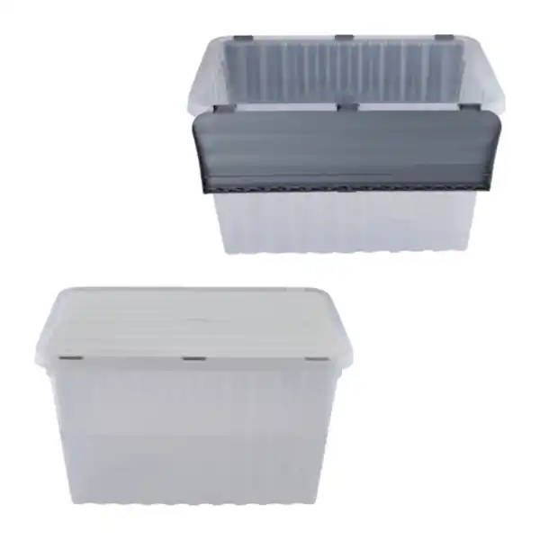 Polypropylen; Deckel zweiteilig mit je 3 Scharnieren und Griffmulde; stapel- und nestbar; Volumen: ca. 53 L; B x H x T: ca. 59,4 x 36,2 x 35,6 cm; verschiedene Farbvarianten