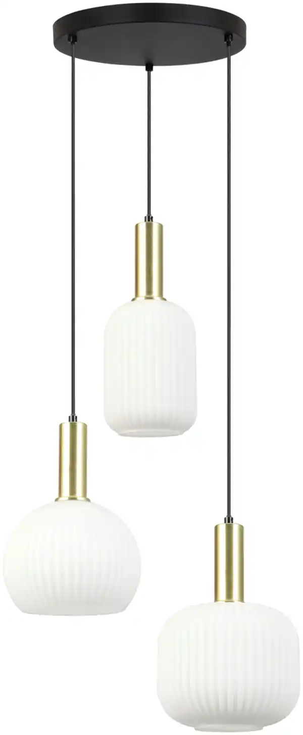 Die Hängeleuchte SCHER in Schwarz/Weiß mit goldfarbenen Akzenten vereint abstraktes Design mit hochwertigen Materialien und wird so zum eleganten Highlight im Indoor-Bereich. Das Zusammenspiel aus lackiertem und vergoldetem Gusseisen sowie mundgeblasenem Opalglas sorgt für eine edle Optik und eine angenehm gleichmäßige Lichtverteilung. Dank der 3-flammigen Ausführung und der E27-Fassungen bietet die Leuchte flexible Lichtgestaltung mit Leuchtmitteln bis max. 25 Watt je Fassung. Mit ihrer runden Form und harmonischen Größe eignet sich die Leuchte ideal für Essbereiche, Wohnräume oder großzügige Flure und misst ca. 36 x 120 Cm (D x H). Die Hochvoltleuchte wird im Netzbetrieb mit 230 V betrieben und überzeugt durch einfache Montage, teilmontierte Lieferung sowie geprüfte Sicherheit durch CE- und RoHS-Zertifizierung. Das opalweiße Glas schafft eine warme, wohnliche Atmosphäre mit stilvollem Charakter. HINWEIS