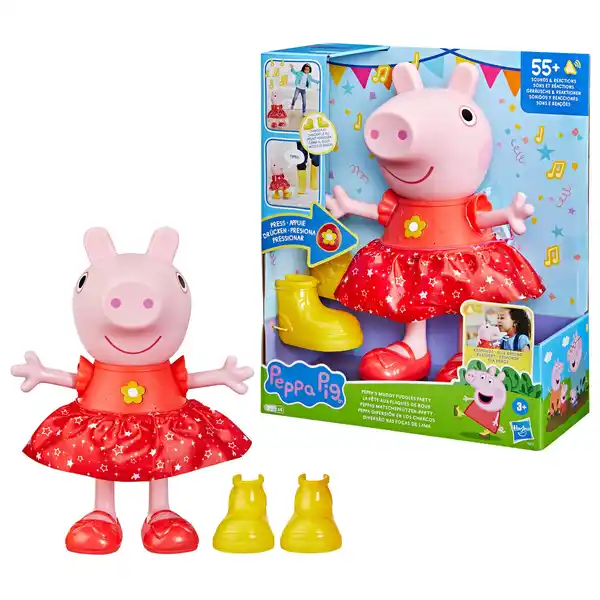 Hier steigt die Party mit Peppa Wutz. Peppas Matschepfützen-Party Puppe lädt die kleinen Fans zum Mitmach-Spaß ein! Dieses interaktive, sprechende, singende und tanzende Spielzeug für Kinder ab 3 Jahren kann die Fantasie der Kleinen beflügeln und sie dazu bringen, sich mit ihrer besten Freundin Peppa zu bewegen und zu tanzen! Kinder können Peppa die kultigen gelben Gummistiefel an- und ausziehen, um sie in den Matschepfüzen-Modus oder den Party-Modus zu versetzen, um zwischen Geräuschen, Sätzen, Melodie und Spiel zu wechseln. Sie reagiert außerdem auf Geräusche mit Sätzen und Soundeffekten. Jedes Kind, das Peppa Pig Figuren oder Peppa Pig Spielsets liebt, wird von diesem interaktiven elektronischen Spielzeug für Mädchen und Jungen begeistert sein. © 2023 ABD Ltd/Hasbro/HCPL Ltd. HASBRO und PEPPA PIG und alle dazugehörigen Marken TM&© 2023 Hasbro/Hasbro Consumer Products Licensing Ltd.
