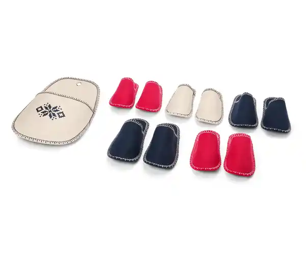 Hausschuh-Set Farbe: 2x rot, 2x dunkelblau, 1x creme Material: 100% Polyester 5 Paar Hausschuhe in verschiedenen GrößenSchlupfformInkl. AufbewahrungstascheAus recyceltem MaterialGrößen: 36/37, 38/39, 40/41, 42/43 und 44/45Dieses Hausschuhe schonen Ressourcen.