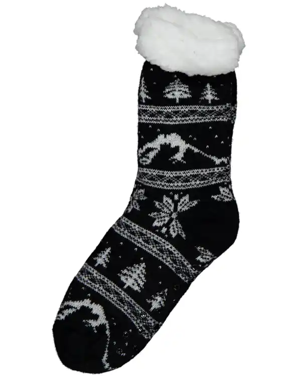 Dieser schwarze Hausschuh für Damen besteht aus 100% Polyester. Der obere Rand innen ist weich und weiß, was für zusätzlichen Komfort sorgt. Die Socke fühlt sich warm an und hat ein Muster mit Bergen, Bäumen und Schneeflocken. Ideal für zu Hause, wenn du gerne warme und weiche Socken an den Füßen trägst.