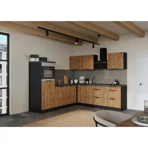 Held Eckküche Liverpool, Graphit, Eiche Wotan, Metall, 5 Schublade(n) Schubladen, seitenverkehrt montierbar, L-Form, nur wie online abgebildet bestellbar, 240x240 cm, Made in Germany, links aufbauba