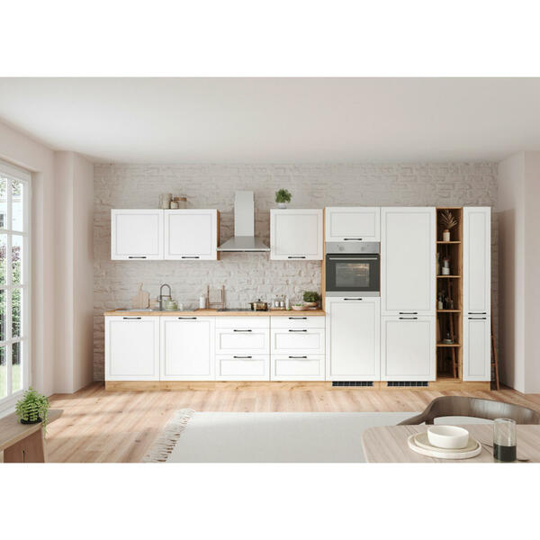 HeldKÜCHENBLOCK, in der Farbe Weiß, Eiche Wotan, aus dem Material Metall Das Möbelstück hat 5 Schubladen. die Türen sind Drehtür,Drehtür,Drehtür,Drehtür. die Form des Artikels ist seitenverkehrt montierbar, nur wie online abgebildet bestellbar., die Energieeffizienzklasse ADer Artikel hat eine Größe von 420 cm., hat die Auszeichnung: Made in Germany., die Besonderheiten des Artikels sind höhenverstellbare Füße., folgendes ist beim Kauf dieses Artikels dabei: E-Geräte, Spüle.