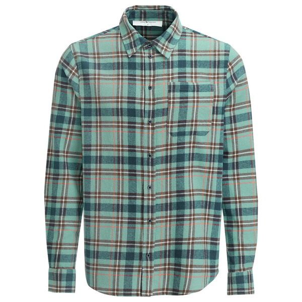 Hellgrünes Hemd aus weicher Qualität mit karierten Dessin in Braun, Orange und Weiß. Mit Kentkragen, Knopfleiste und aufgesetzter Brusttasche. Einfach geknöpfte Armausschnitte und leicht abgerundeter Saum.