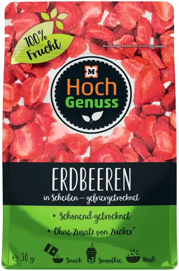 Die gefriergetrockneten Erdbeerchips von HOCHGENUSS bieten puren Fruchtgeschmack für zwischendurch und zum Verfeinern von Speisen. Die knusprigen Erdbeerscheiben sind eine köstliche Ergänzung für eine bewusste Ernährung.