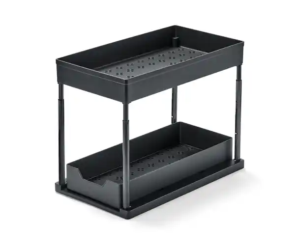 Höhenverstellbarer Schrankauszug Farbe: Schwarz Material: Stangen Stahl, pulverbeschichtet Fach, Auszug, Boden und Schutzkappen 100% Acrylnitril-Butadien-Styrol Füße 100% Silikon Maße: Höhe ca. 28 bis 40 cm B x H x T oberes Fach ca. 39,5 x 5,8 x 22 cm B x H x T unteres Fach ca. 38,5 x 6 x 18 cm Inhalt: Inkl. Gebrauchsanweisung Tragkraft: Oberes Fach max. 3 kg Unterer Auszug max. 5 kg Gebrauchsanweisung: Nur für trockene Lebensmittel geeignet Zweistöckiger Ordnungshelfer für Küche, Bad oder BüroHöhenverstellbar Unteres Fach ausziehbar4 rutschfeste Füße Einfache Montage