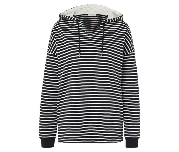 Hoodie, dunkelblau gestreift Farbe: Dunkelblau-weiß gestreift Material: 60% Baumwolle, 40% Polyester Maße: Gesamtlänge ca. 72 cm (Gr. M 40/42) Passform: Regular Fit Weiche Qualität mit BaumwolleKapuze mit Tunnelzug und BindebandWeich und wärmend durch leicht angeraute InnenseiteKleiner V-AusschnittSaum mit SeitenschlitzenÜberschnittene Schultern