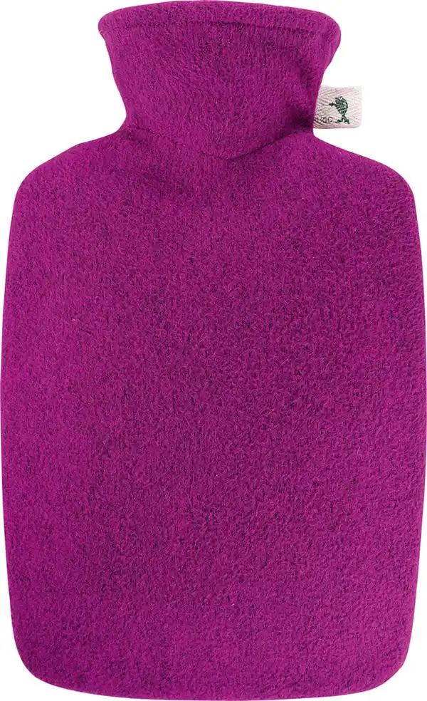 Die Wärmflasche steckt in einem weichen Strickbezug in Filzoptik, Himbeere-melange.