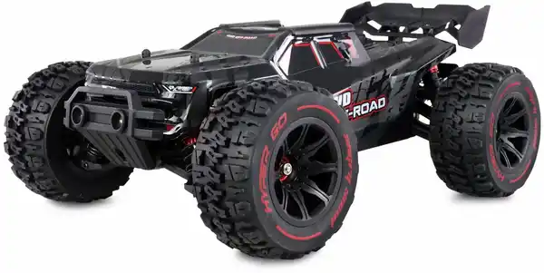 Der Hyper Go Brushless Truggy im Maßstab 1:14 kommt dank seines brachialen 4WD-Antriebs auf über 55km/h Top-Speed. Hochwertige Komponenten wie die Aluminium-Öldruck-Stoßdämpfer, Metall-CVD-Antriebswellen, -Kardanwellen, -Getriebe und -Differentiale sorgen für eine hohe Langlebigkeit dieses Offroad-Racers. Ein aktiver Lüfter am Motor ermöglicht optimale Kühlung. Das einstellbare Fahrwerk, welches auf einer Aluminium-Chassisplatte sitzt, sorgt für extreme Spurtreue. Eine Wheelie-Bar für mehr Fahrstabilität runden das Paket zusätzlich ab. Die gesamte Elektronik ist vor Spritzwasser geschützt und erlaubt den uneingeschränkten Outdooreinsatz. Die groß dimensionierten High-Grip-Reifen aus weichem Gummi sorgen bei Vollgas für Halt auf nahezu jedem Untergrund. Speziell für Sand vorgesehen, sind dem Hyper Go Truggy zusätzliche Sandpaddelräder beigelegt. So steht auch dem Fahrspaß beispielsweise am Strand oder in der Sandgrube nichts im Wege. Die handliche 3-Kanal Fernsteuerung übermittelt nicht nur alle Funktionen störungssicher, sondern über einen zusätzlichen Knopf lassen sich die Scheinwerfer vorne an- und ausschalten. Das 2,4GHz System lässt zudem auch den Betrieb mehrerer Modelle parallel zu. Wenn es einmal nicht so schnell sein soll, verfügt der Sender über einen Schalter, der die maximale Geschwindigkeit auf 70 Prozent drosselt. Das RTR-Paket ist mit allen nötigen Komponenten – bis auf haushaltsübliche Batterien für die Fernsteuerung – ausgestattet. Für Fahrer, die gerne etwas Abwechslung bei der Optik haben möchten, ist sogar eine zweite goldfarbene Karosserie beigelegt. Zudem sind neben den optionalen Zubehörteilen wie der Wheelie Bar und härteren Dämpferfedern noch jede Menge Ersatzteile wie vordere Querlenker, Karosseriehalter und Ersatz-Heckflügel im Lieferumfang enthalten.