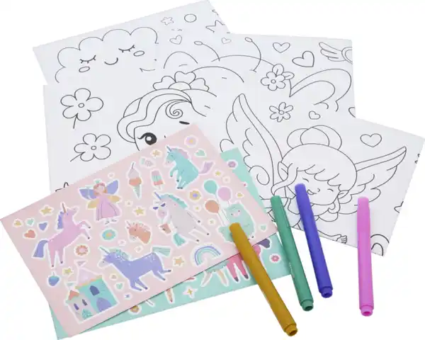 - Inhalt: 4 Bögen in DIN A2 mit Motiven, 2 Stickerbögen und 4 Kreidemarker in verschiedenen Farben