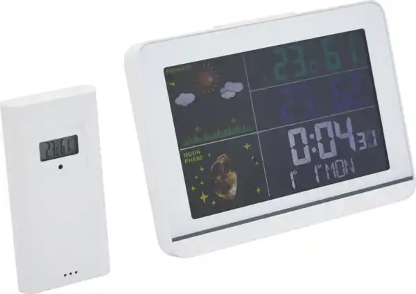 - Anzeige von Temperatur und Feuchtigkeit im Innen- und Außenbereich inkl. Mondphasen
