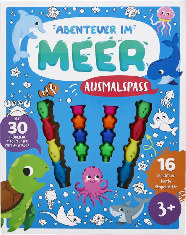In diesem Meeresabenteuer-Malbuch findest du über 30 Gute-Laune-Bilder zum Ausmalen. Fische, Schildkröten, Wale und viele andere freundliche Meeresbewohner warten darauf, von dir mit fröhlichen Farben zum Leben erweckt zu werden. Mit den 16 tollen Stapelstiften macht das Ausmalen besonderen Spaß. Ein kreatives Unterwasser-Abenteuer, das viele Stunden lang begeistert.