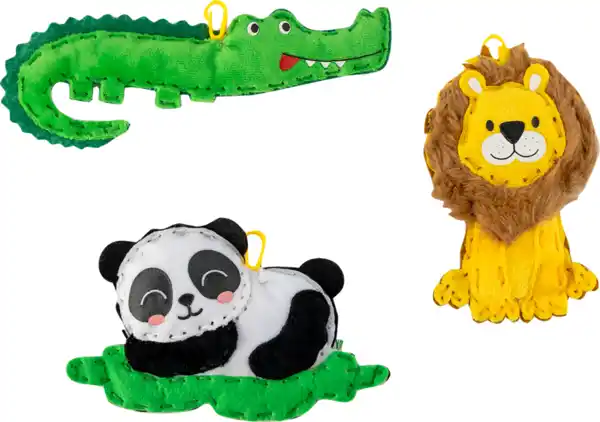 - vorgestanzte Filzteile, Stickgarn, Kunststoff-Karabiner, kindersichere Nadel und Füllwatte