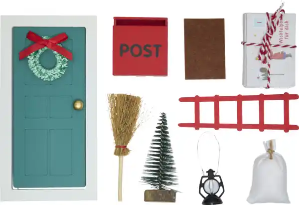- Inhalt: 1 Tür, 1 Leiter, 1 Postkasten, 1 Besen, 1 Sack, 1 Laterne, 1 Fußmatte und 1 Baum plus 24 Briefbotschaften