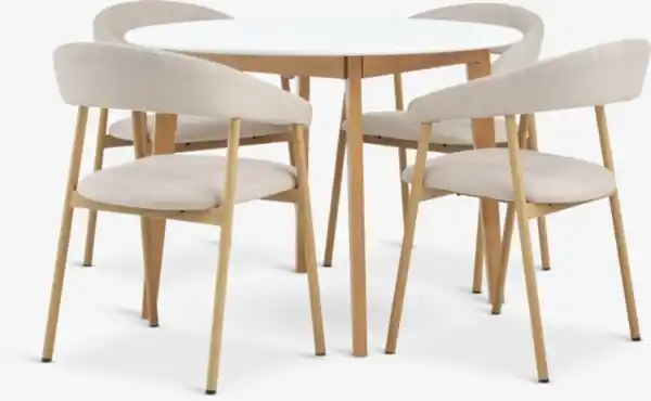 JEGIND Ø105 Tisch weiß + 4 EJSING Stühle beige/ Eiche natur