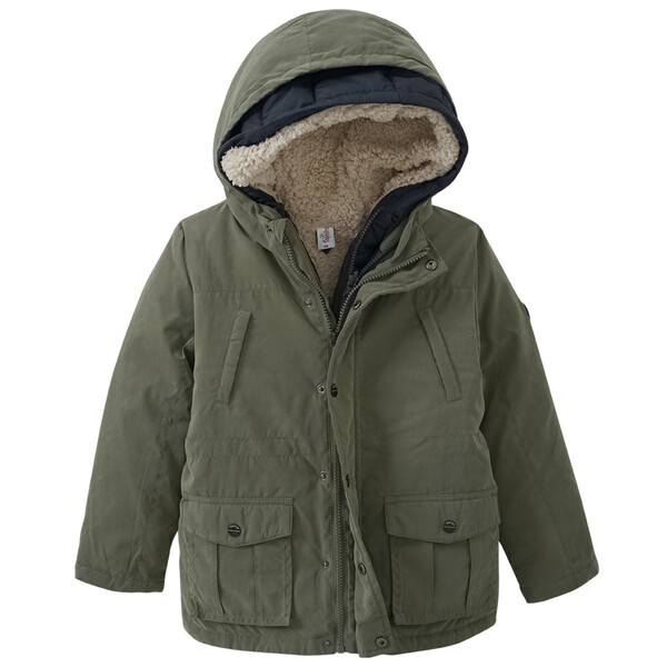 Für alles gewappnet! Dunkelgrüne Jacke im Parka-Look mit herausnehmbarer Steppjacke in Dunkelblau. Jacke mit Kinnschutz am Reißverschluss, verdeckender Druckknopfleiste, zwei schräg platzierten, imitierten Einschubtaschen sowie zwei Taschen mit Druckknöpfen. Leicht gefüttert. Schlichte Steppjacke mit Reißverschluss und Kapuze. Mit Teddyplüsch gefüttert. Dreifach verwendbar - tragbar einzeln als Jacke oder Steppjacke sowie zusammengezippt als warme Kombination. Der Global Recycling Standard (GRS) hilft uns, den Recyclinganteil unserer Produkte zu überprüfen. Darüber hinaus wird kontrolliert, ob die durch den Standard festgeschriebenen sozialen, ökologischen und chemischen Vorschriften in der Produktion erfüllt werden.