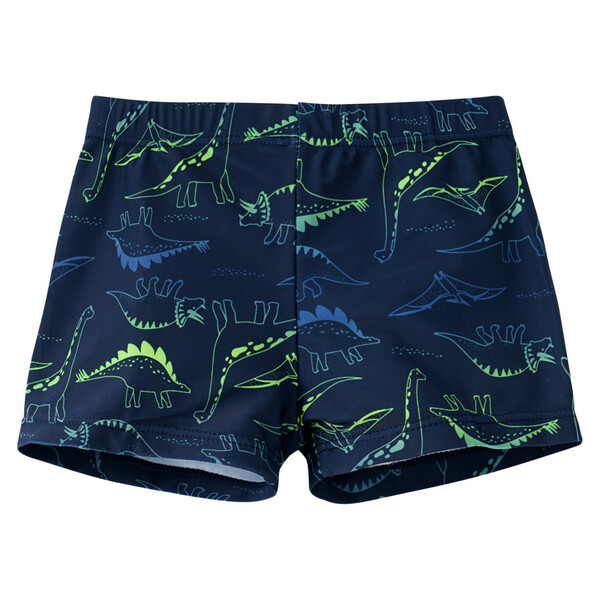 So viele Dinos! Dunkelblaue Badehose mit Dino-Motiven in Grün und Blau allover. Tunnelzug mit dunkelblauem Band im Elastikbund. Mit elastischen Beinausschnitten für einen optimalen Sitz. Im Schritt gefüttert. Figurnahe Retro-Passform mit kurzem Bein.