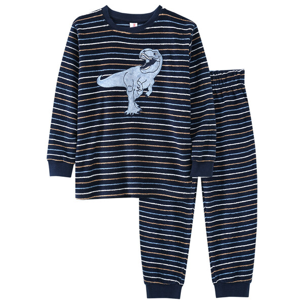Gemütliche Nächte! Dunkelblaues Langarmshirt mit Streifen aus kuscheligem Nicki und mit Dinosaurier-Motiv auf der Front. Mit angesetztem Rippenbündchen am Rundhalsausschnitt und gerippten Bündchen an den Armausschnitten. Dunkelblau gestreifte Schlafhose mit elastischem Bund. Gerippte Bündchen an den Beinausschnitten sorgen für einen bequemen Halt. Cotton made in Africa setzt sich für einen ökonomisch, sozial und ökologisch nachhaltigeren Baumwollanbau in Subsahara-Afrika ein und trägt damit zu einer Verbesserung der Lebensbedingungen kleinbäuerlicher Familien bei.